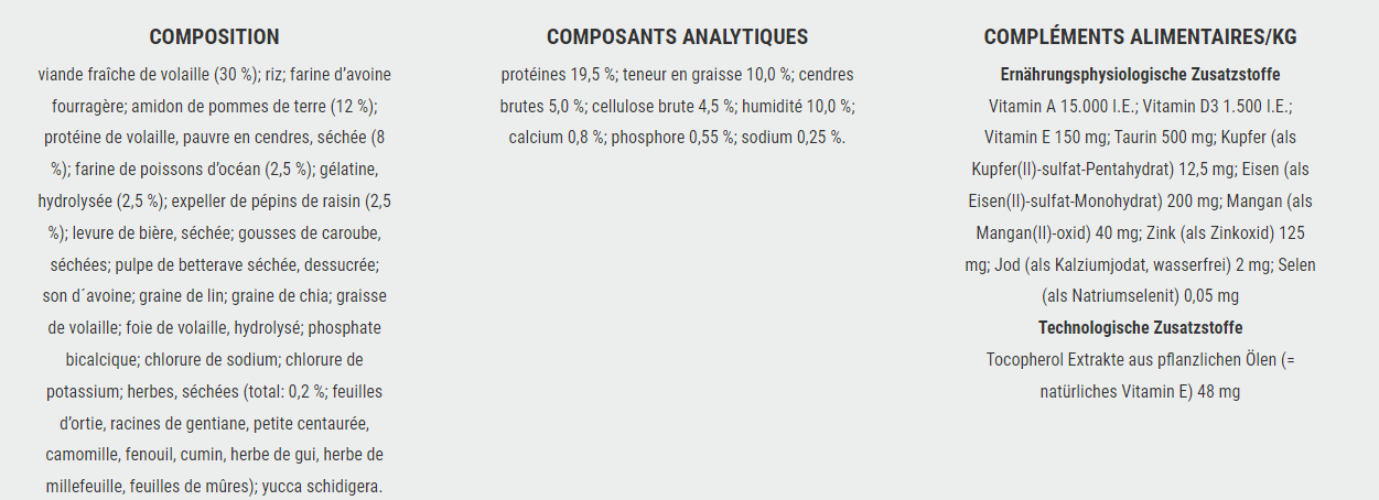 Les rations moyennes pour l’alimentation des chiens adultes sont indiquées dans le tableau. Un contrôle régulier du poids du chien permet de déterminer au mieux la quantité d’aliments adaptée. Donner simplement à sec. De l’eau fraîche doit toujours être à disposition.