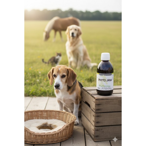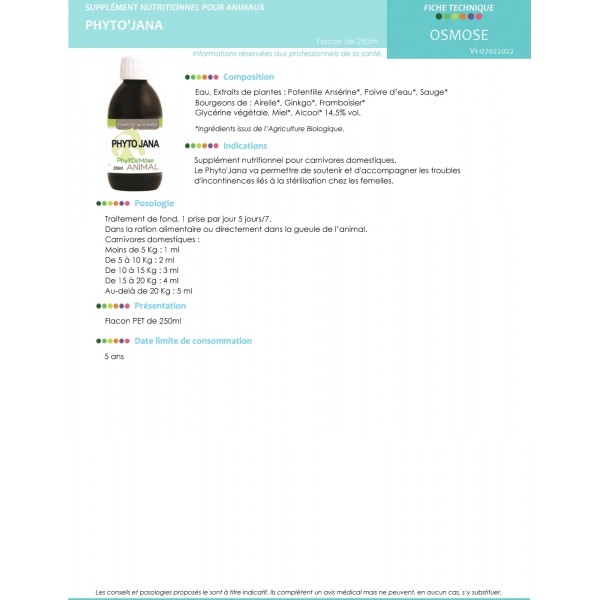 Complexe performant de 3 plantes en extrait fluide glyceriné miellé et de 3 bourgeons macératè , le Phyto'Jana va permettre de soutenir et d'accompagner les troubles d'incontinences lié a la stérilisation chez les femelles.
